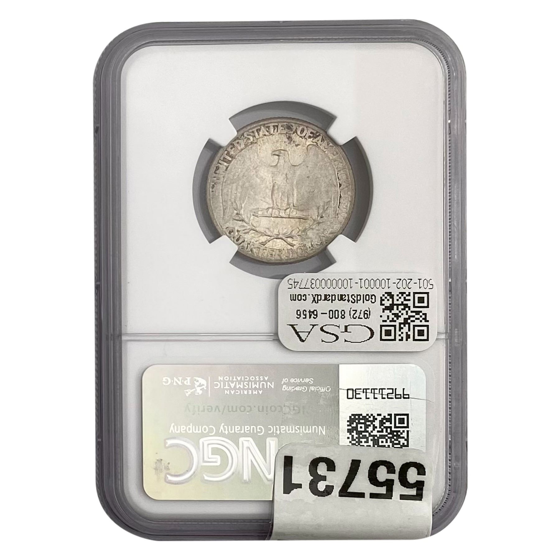 e. Coins sold referencing a third-party grading service are sold “AS IS” without any express or implied warranty, except for a guarantee by GSA that they are genuine. Removal or alteration of the holder, voids all of Bidder’s claims concerning that Product. Certain warranties may be available from the grading services and Bidders are referred to them for further details: Numismatic Guaranty Corporation (NGC), PO Box 4776, Sarasota, FL 34230, www.ngccoin.com/services/writtenguarantee.asp; Professional Coin Grading Services (PCGS), PO Box 9458, Newport Beach, CA 92658, www.pcgs.com/guarantee.html; ANACS, 6555 S. Kenton St., Ste. 303, Englewood, CO 80111; and Independent Coin Grading Co. (ICG), 7901 East Bellview, Ave., Suite 50, Englewood, CO 80111.