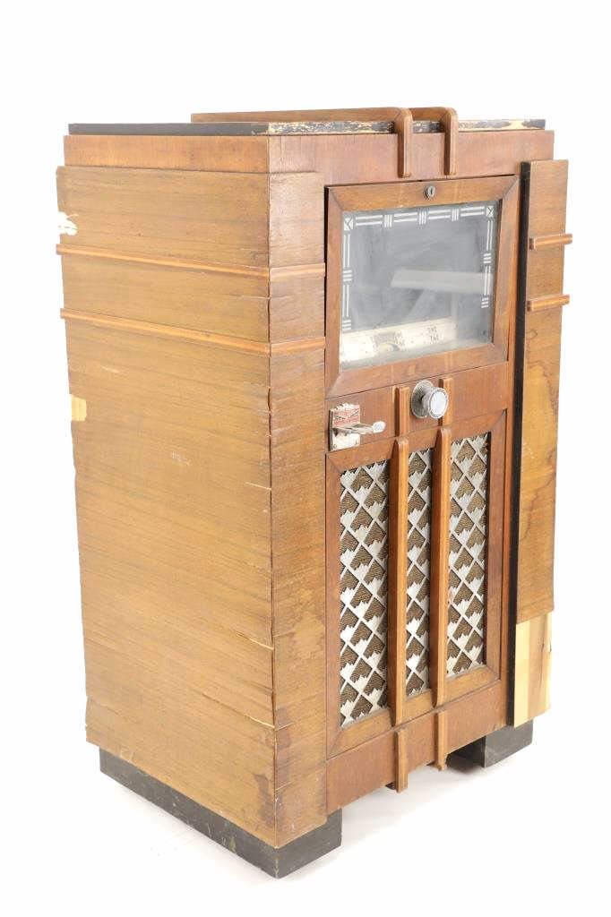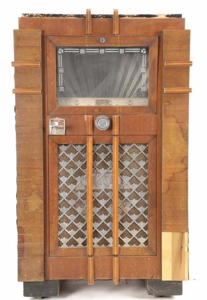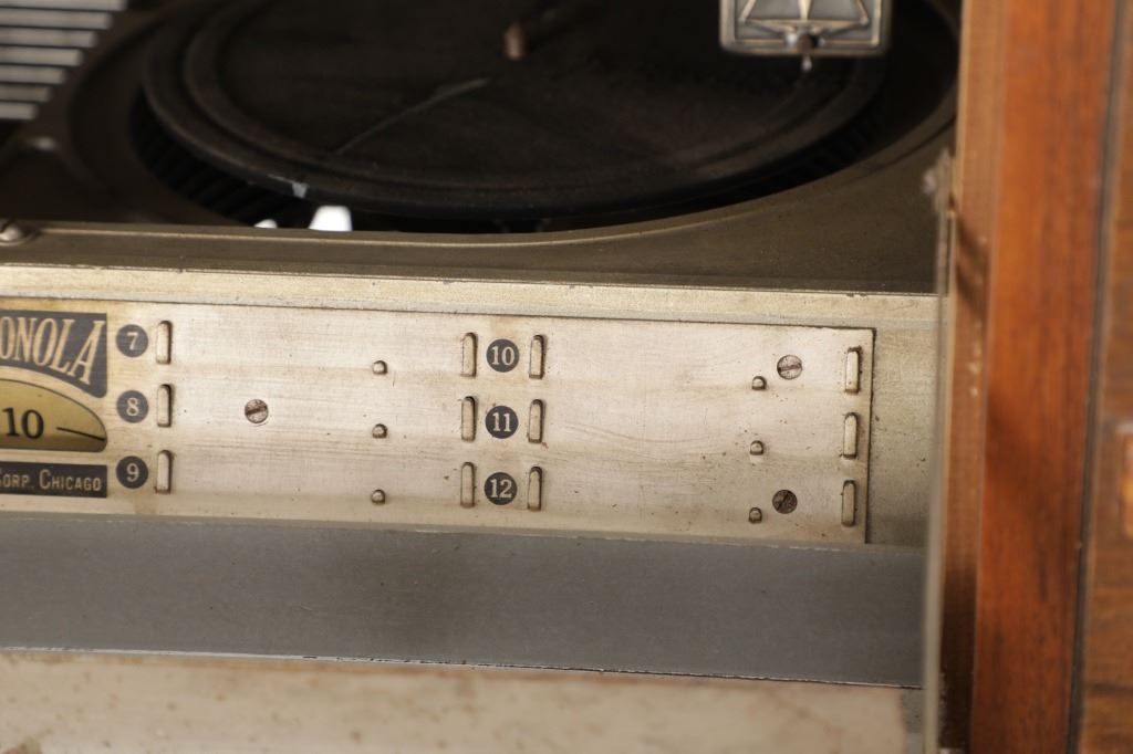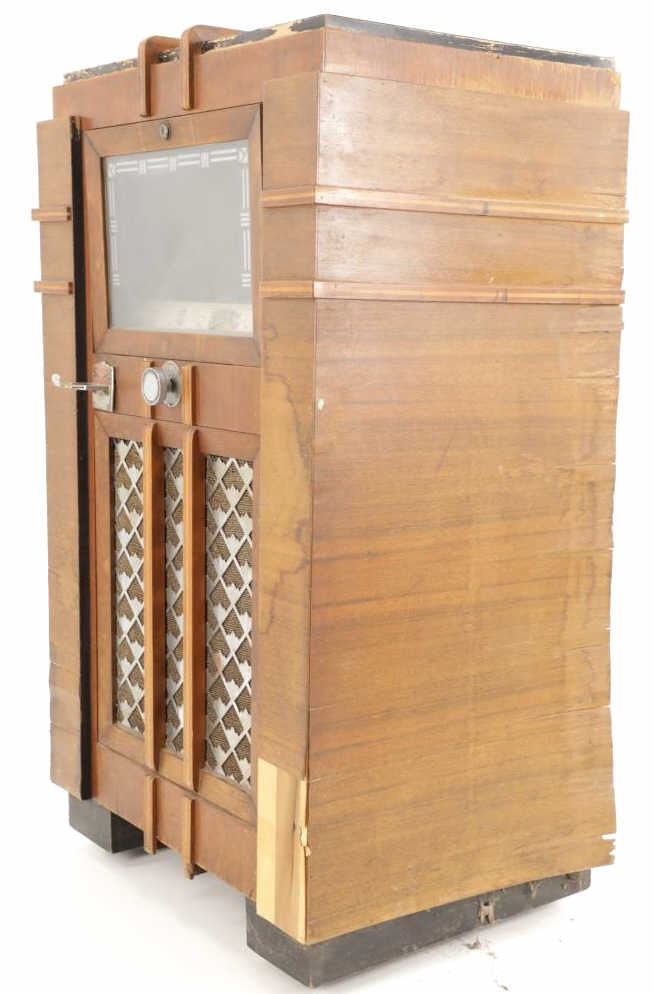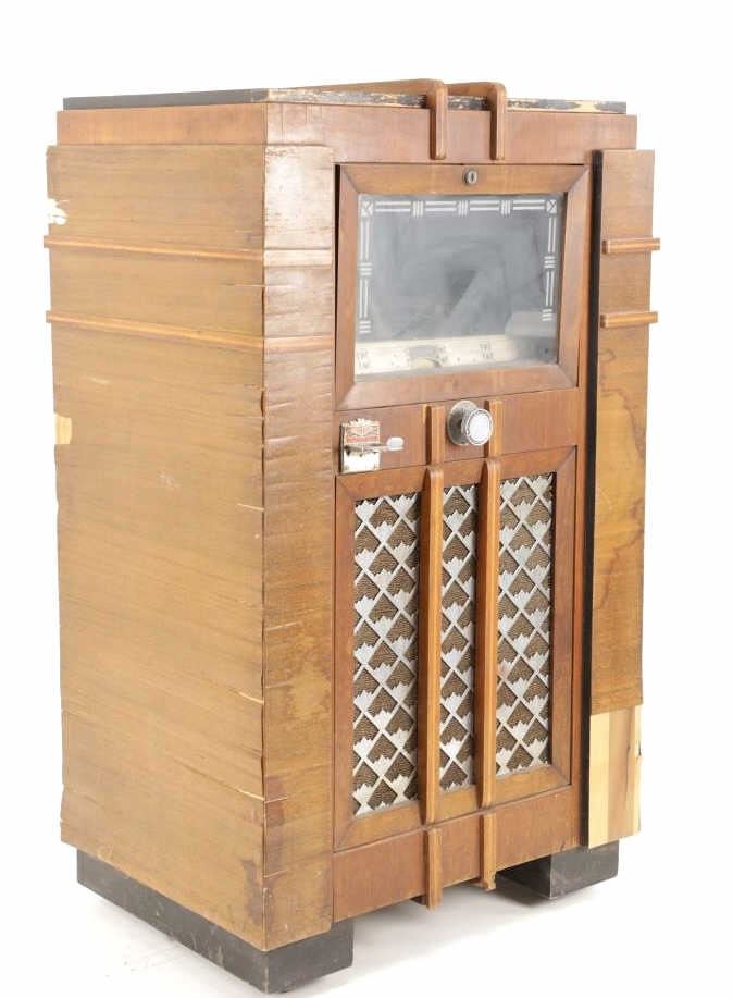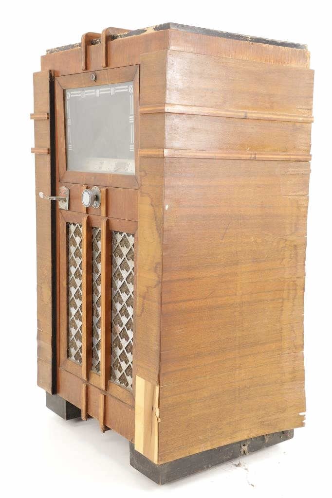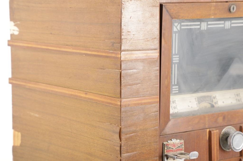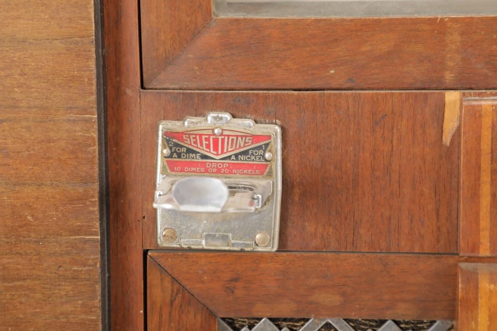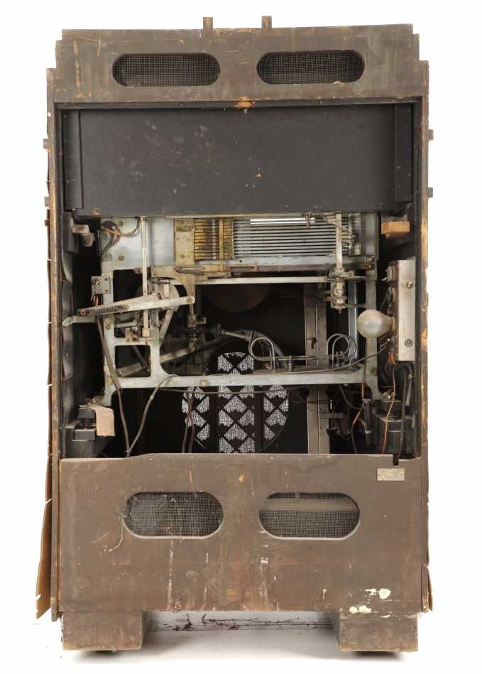 The jukebox shows a beautiful art-deco wood design with a clear glass sheet in the front to showcase the automatic record selection and lights to show which number record was playing. The front shows a metal grate over where the speakers would have faced in the internal components and a large metal knob used to switch the records in the jukebox. The amplifier, located in the back of the jukebox is an SB-7 amplifier and features two #56 tubes, two 2A3 tubes, and one 5Z3 tube. All tubes are original American tubes, and show good condition but have not been tested. The jukebox has not been tested for functionality. The jukebox shows good condition with some wear to the front wood paneling and the electrical components. As stated before, the jukebox has not been tested for functionality. The jukebox measures 21 1/4" L x 30 3/8" W x 51" H.