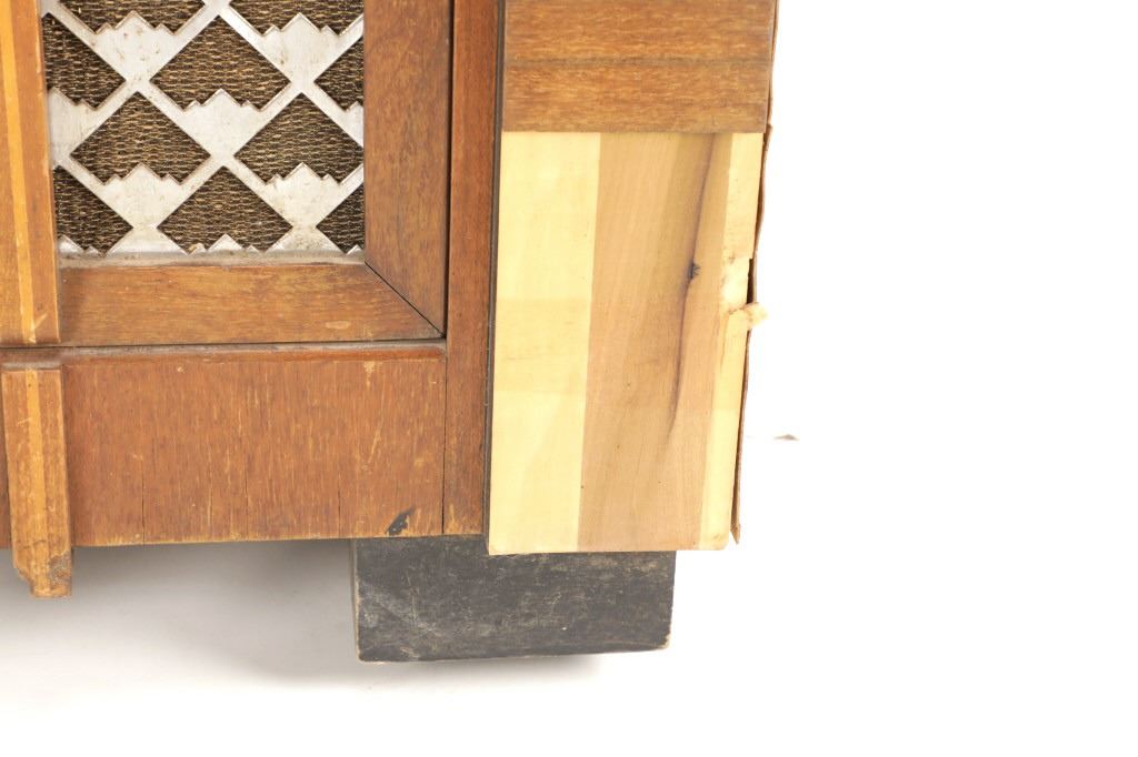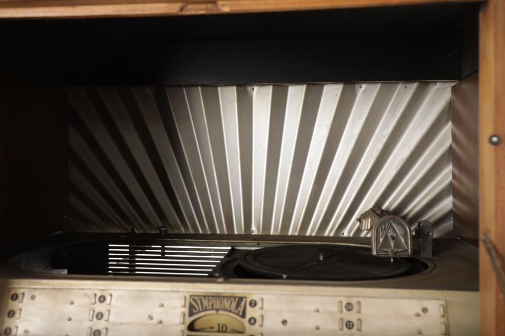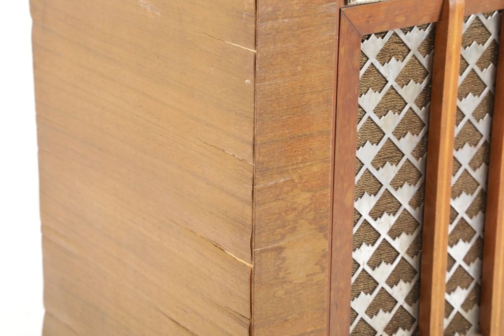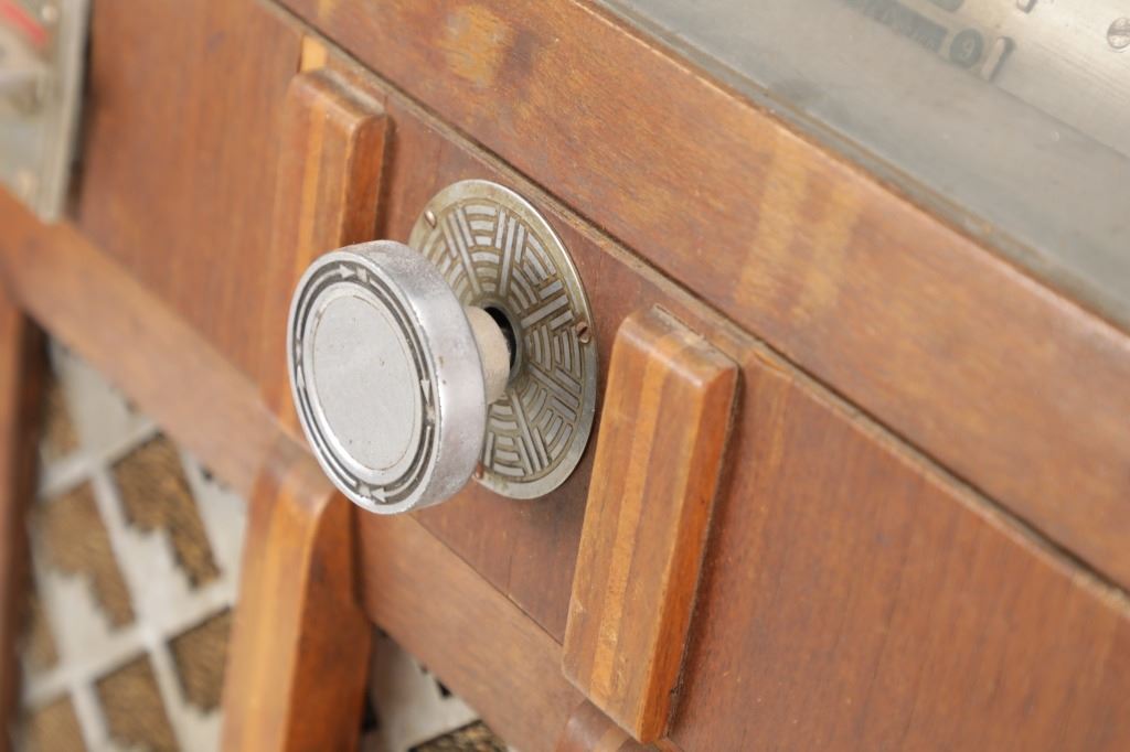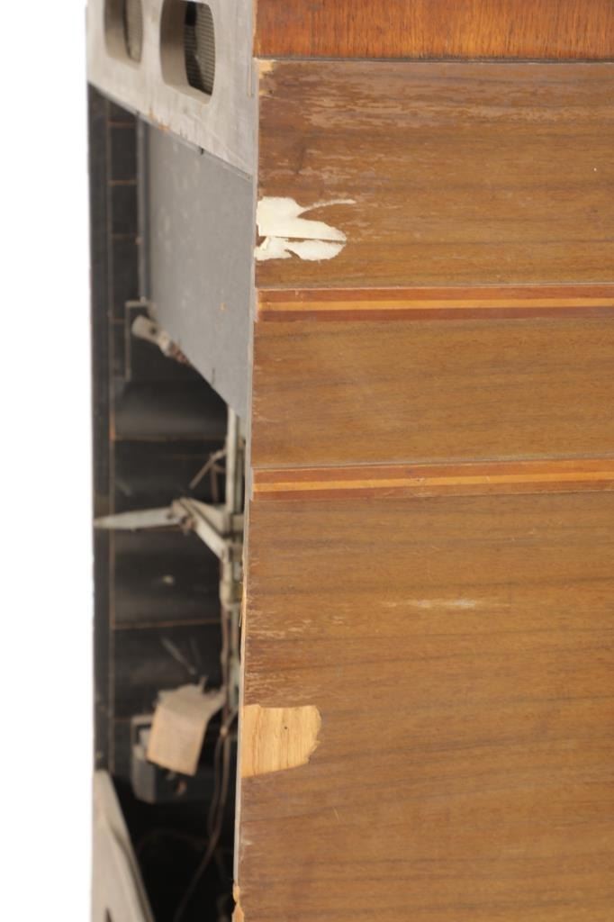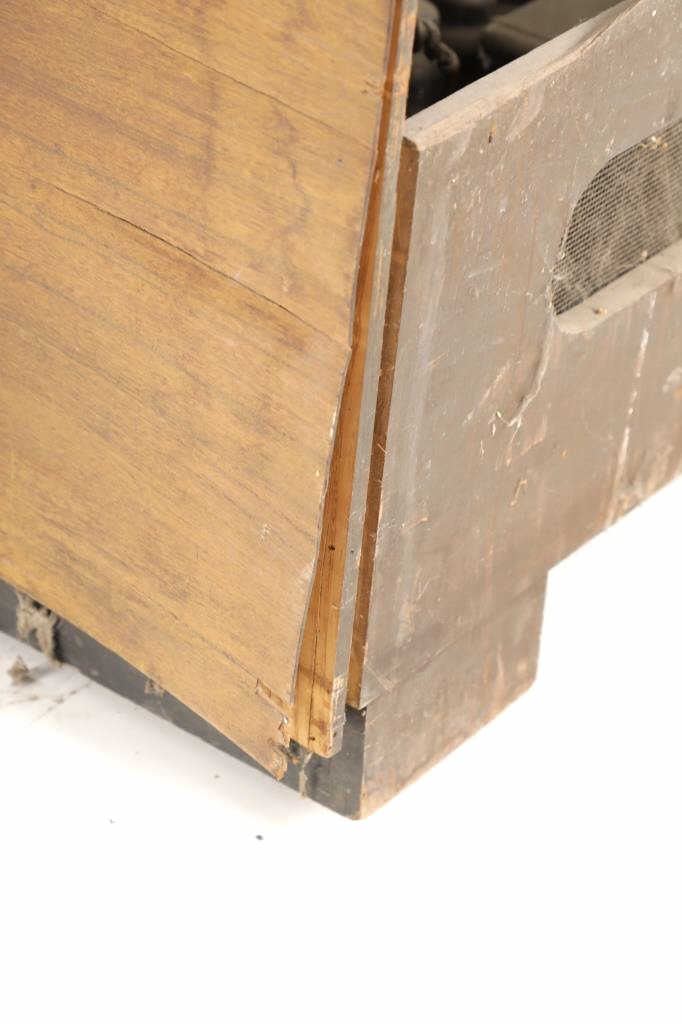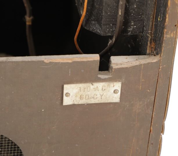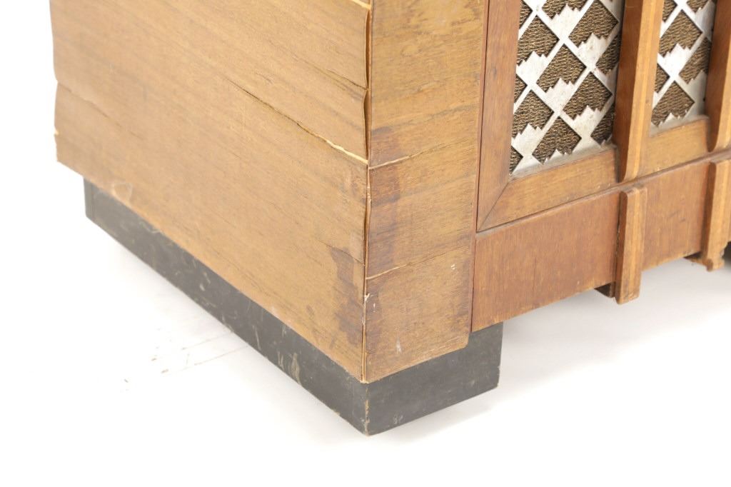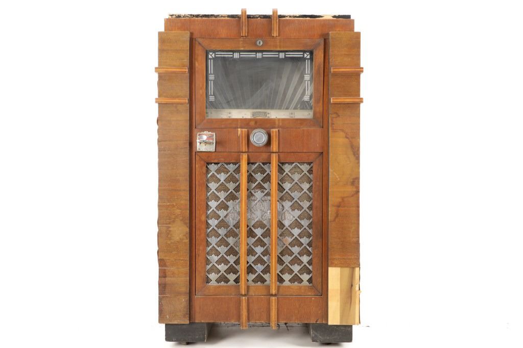 The jukebox shows a beautiful art-deco wood design with a clear glass sheet in the front to showcase the automatic record selection and lights to show which number record was playing. The front shows a metal grate over where the speakers would have faced in the internal components and a large metal knob used to switch the records in the jukebox. The amplifier, located in the back of the jukebox is an SB-7 amplifier and features two #56 tubes, two 2A3 tubes, and one 5Z3 tube. All tubes are original American tubes, and show good condition but have not been tested. The jukebox has not been tested for functionality. The jukebox shows good condition with some wear to the front wood paneling and the electrical components. As stated before, the jukebox has not been tested for functionality. The jukebox measures 21 1/4" L x 30 3/8" W x 51" H.