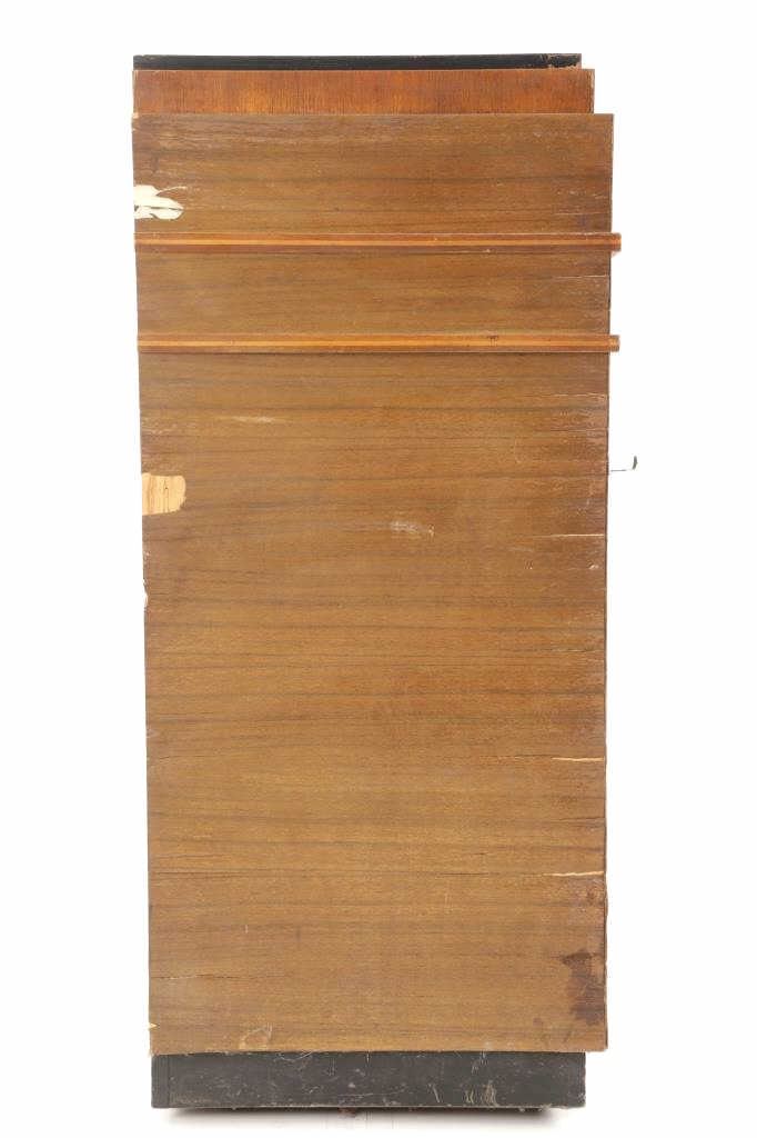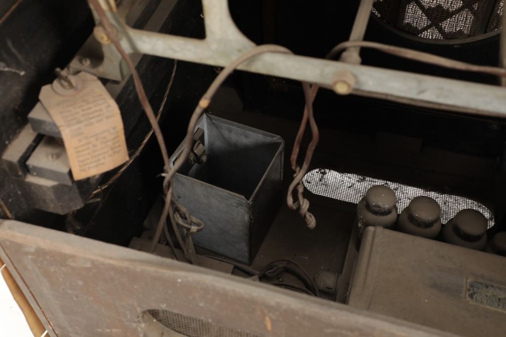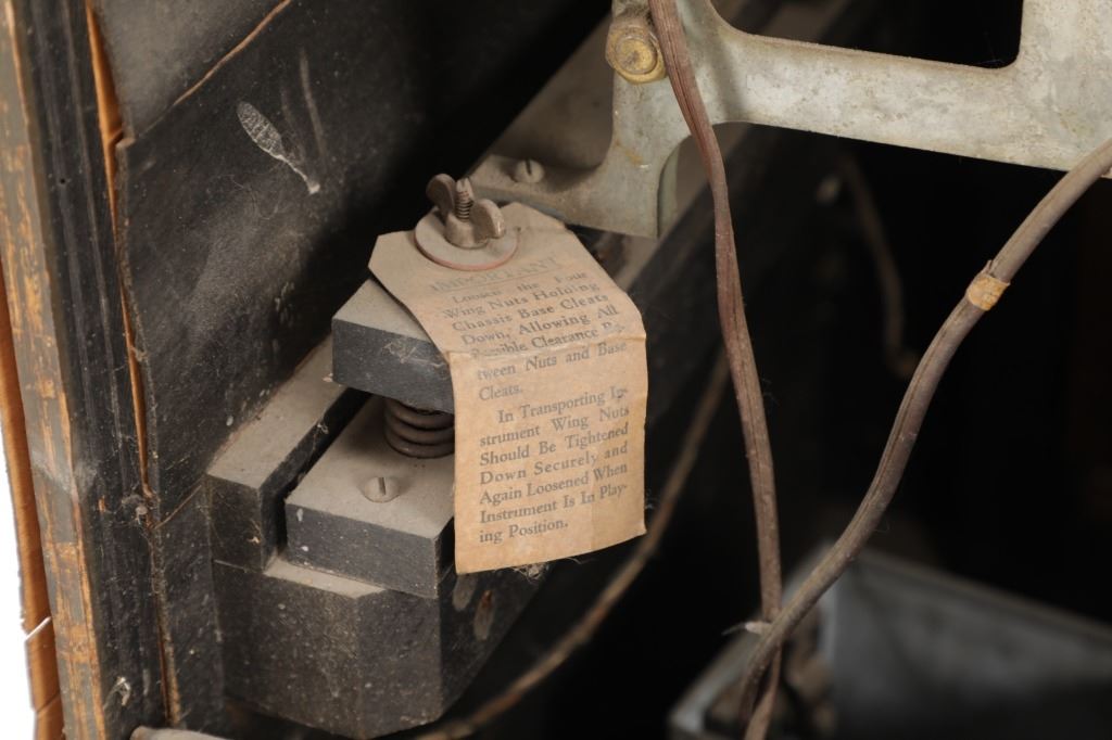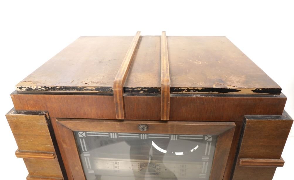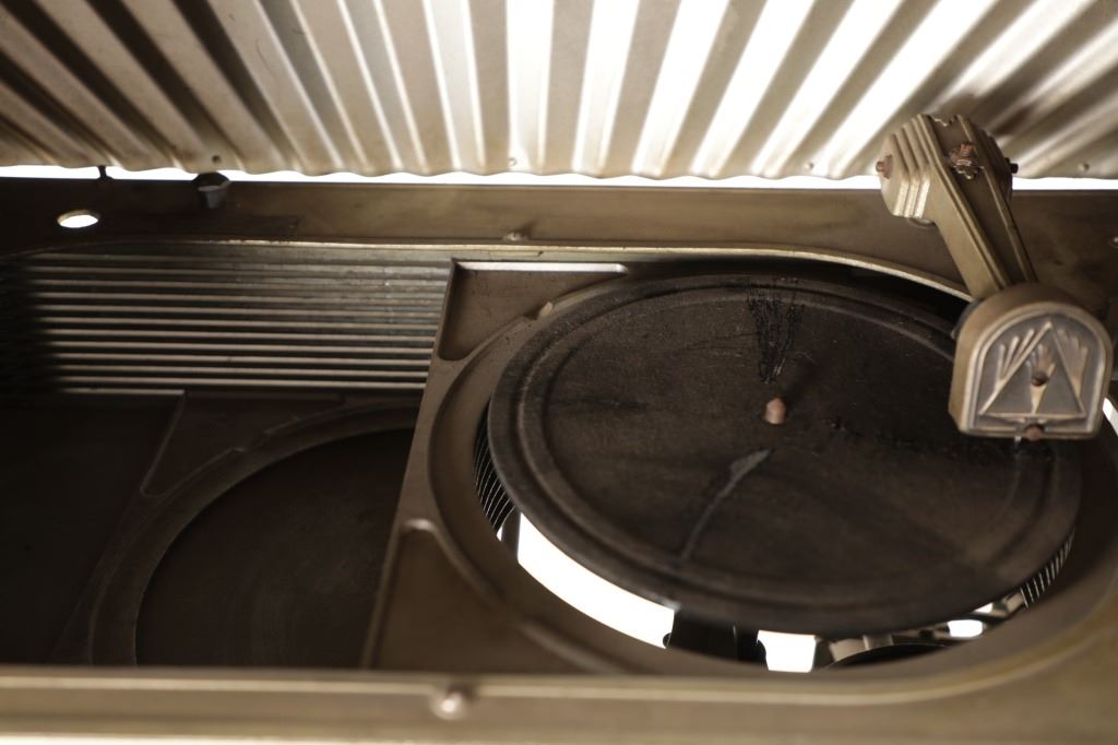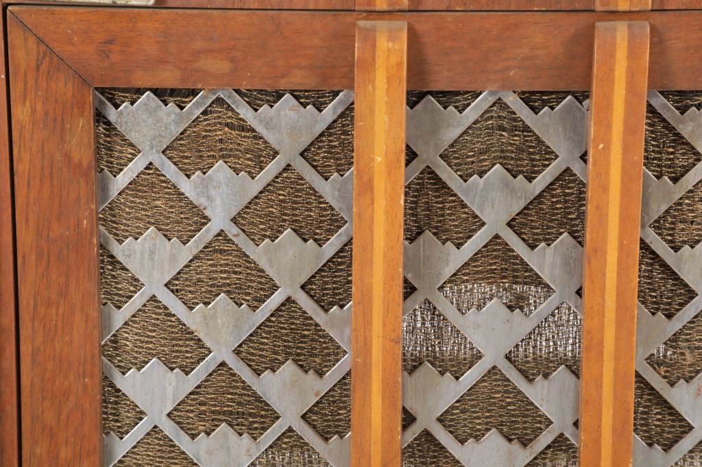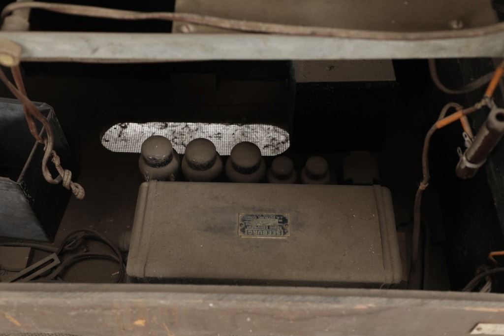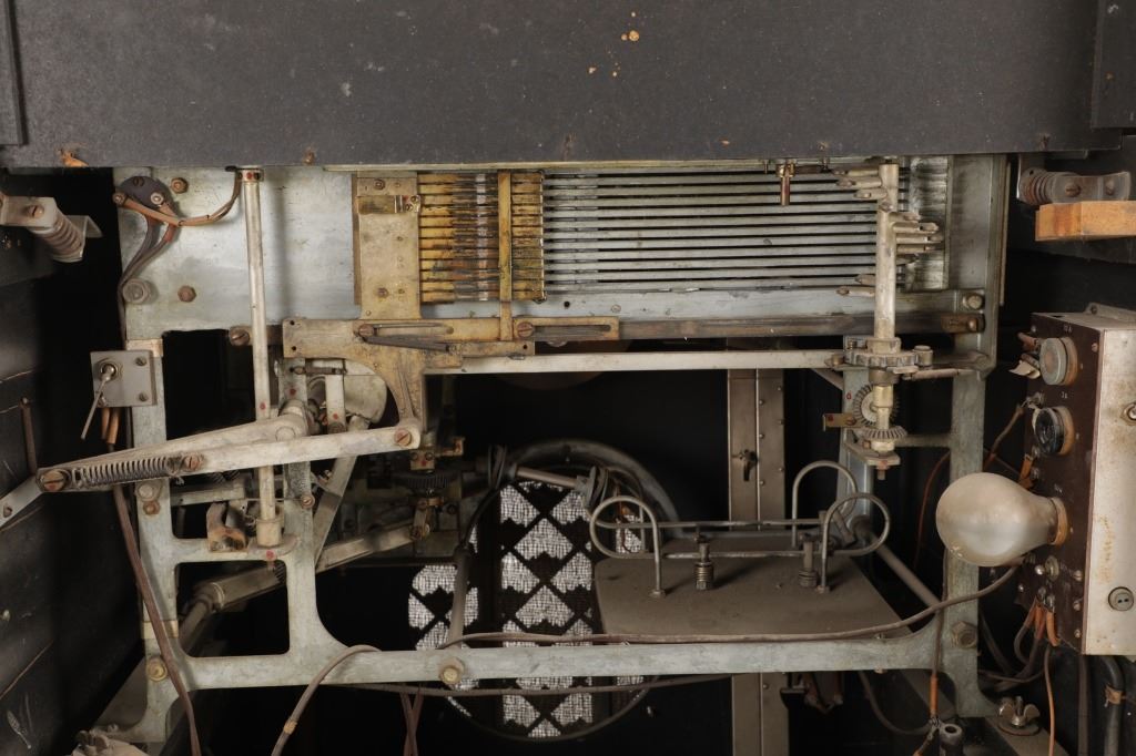 The jukebox shows a beautiful art-deco wood design with a clear glass sheet in the front to showcase the automatic record selection and lights to show which number record was playing. The front shows a metal grate over where the speakers would have faced in the internal components and a large metal knob used to switch the records in the jukebox. The amplifier, located in the back of the jukebox is an SB-7 amplifier and features two #56 tubes, two 2A3 tubes, and one 5Z3 tube. All tubes are original American tubes, and show good condition but have not been tested. The jukebox has not been tested for functionality. The jukebox shows good condition with some wear to the front wood paneling and the electrical components. As stated before, the jukebox has not been tested for functionality. The jukebox measures 21 1/4" L x 30 3/8" W x 51" H.