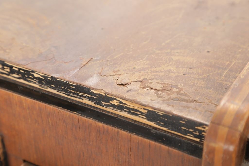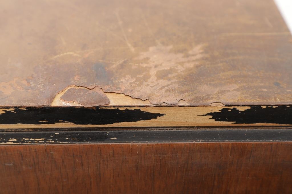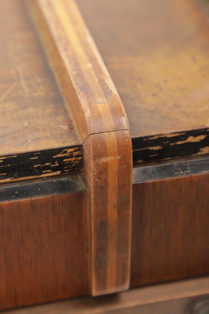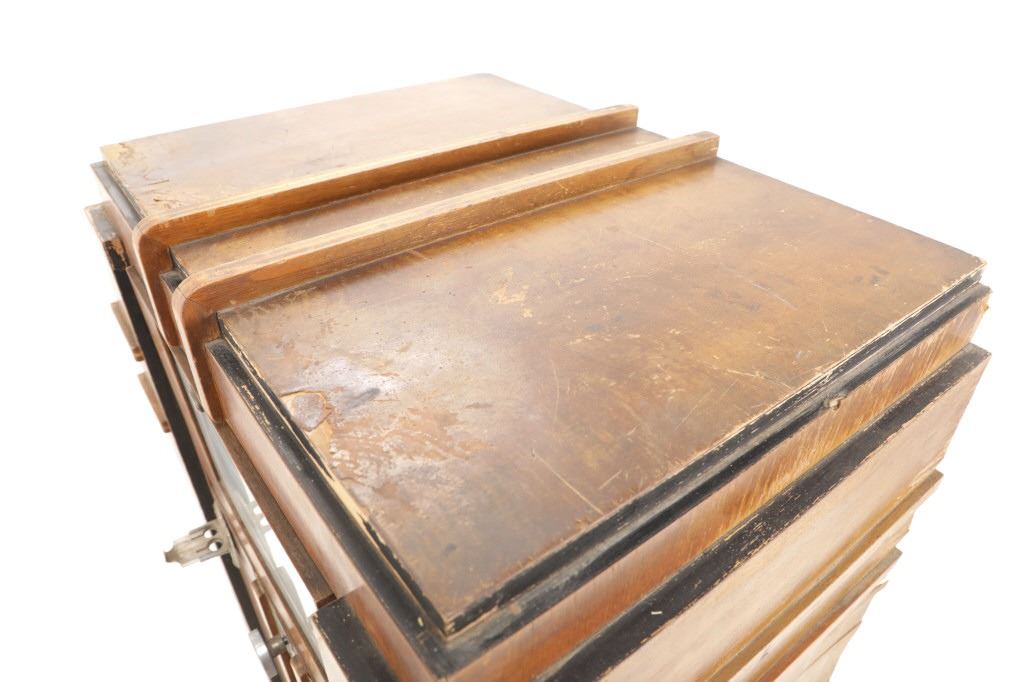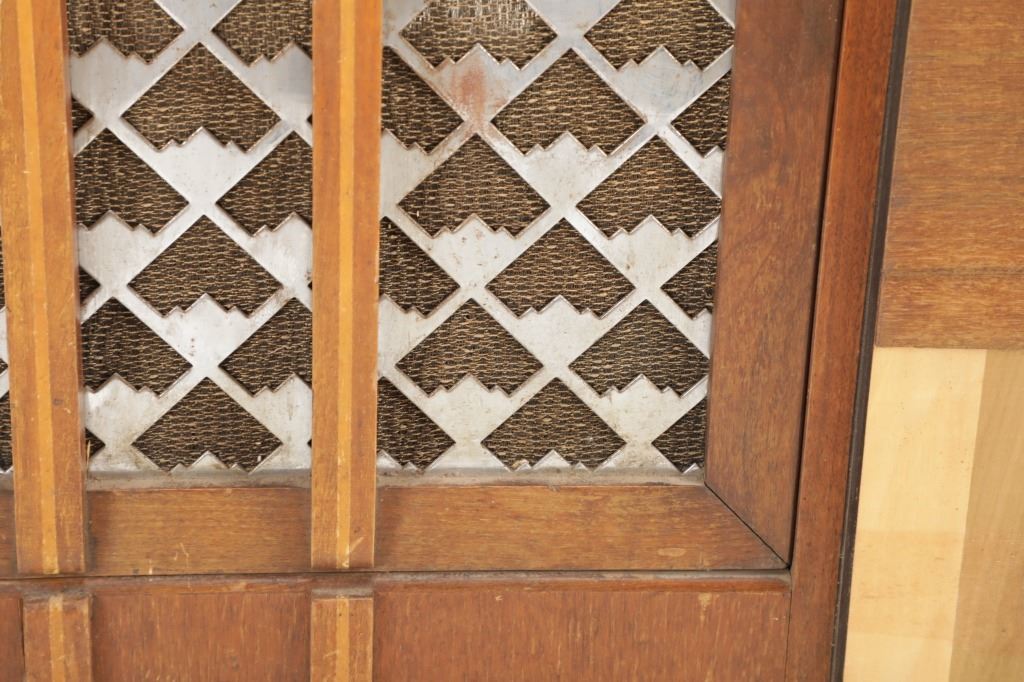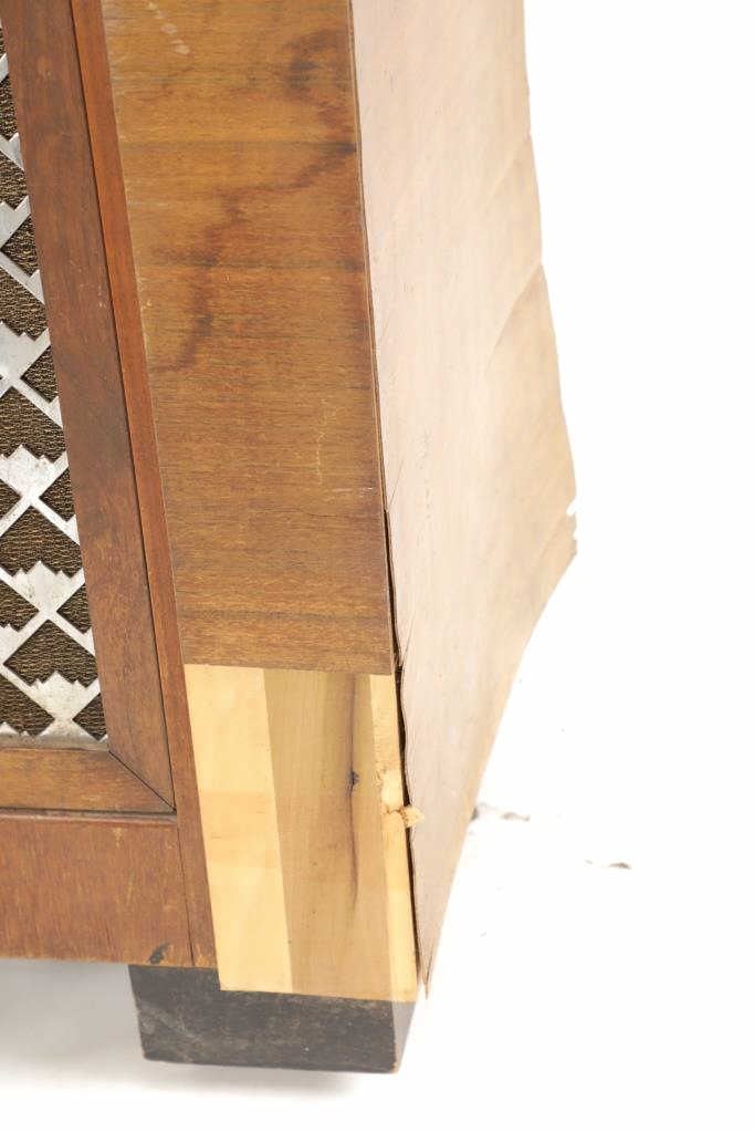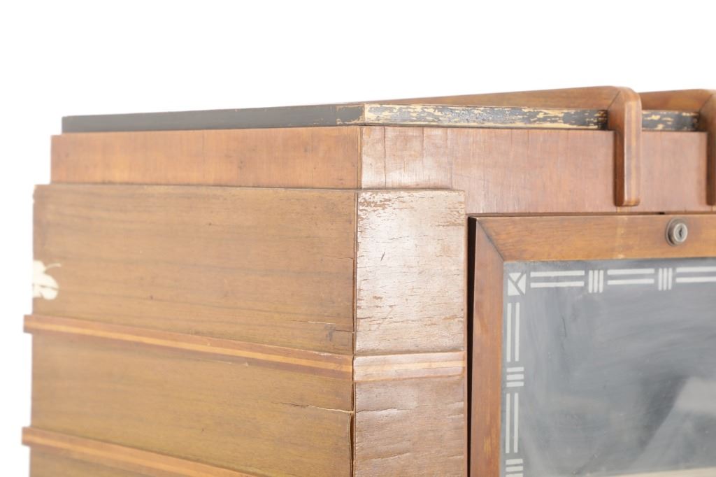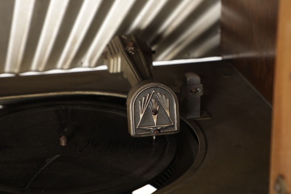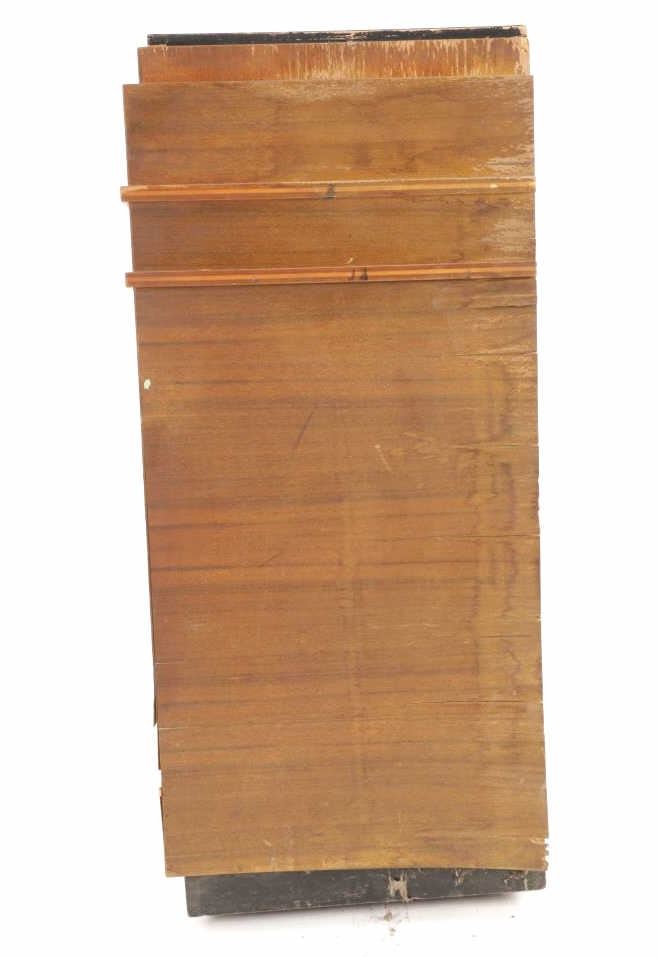 The jukebox shows a beautiful art-deco wood design with a clear glass sheet in the front to showcase the automatic record selection and lights to show which number record was playing. The front shows a metal grate over where the speakers would have faced in the internal components and a large metal knob used to switch the records in the jukebox. The amplifier, located in the back of the jukebox is an SB-7 amplifier and features two #56 tubes, two 2A3 tubes, and one 5Z3 tube. All tubes are original American tubes, and show good condition but have not been tested. The jukebox has not been tested for functionality. The jukebox shows good condition with some wear to the front wood paneling and the electrical components. As stated before, the jukebox has not been tested for functionality. The jukebox measures 21 1/4" L x 30 3/8" W x 51" H.