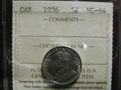 1936 5¢ ICCS MS64. A strong strike example with full beads. Scarce date!