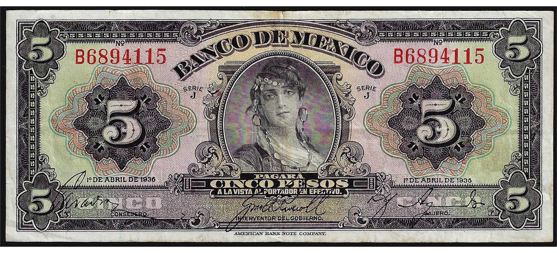 One 1936 5 Pesos Banco De Mexico Bank Note.