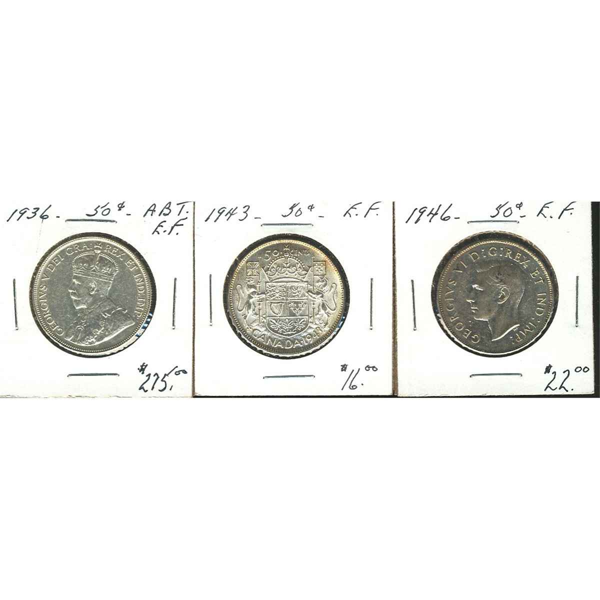 1936 50¢, 1943 & 1946 Abt EF. Lot of 3 coins. (PBA).