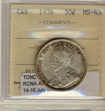 1936 50¢ ICCS MS63. Pleasing issue.