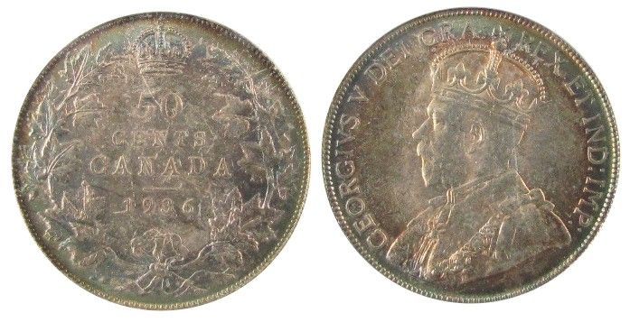 1936 50¢ PCGS MS65. Gem rainbow tones and lustrous. Superb Gem with a sharp strike and great surfaces. This coin has nice eye appeal.