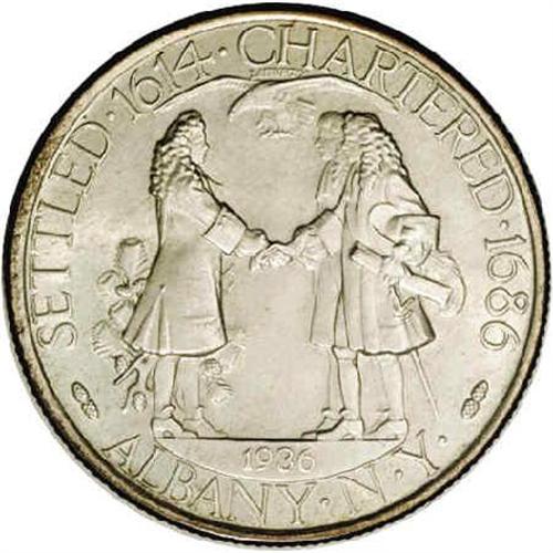 <B>1936<50C> Albany--Improperly Cleaned--NCS. Unc Details.</B></I> A lovely cream-gray Commemorative with satin luster and a meticulous strike. No contact marks are observed, and evidence of past cleaning is extremely slight.