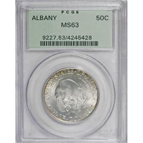 <B>1936 50C Albany MS63 PCGS.</B></I> PCGS Population (528/3599). NGC Census: (127/2360). Mintage: 17,671. Numismedia Wsl. Price for NGC/PCGS coin in MS63: $280. (#9227)<BR><BR><b>Shipping:</b> Coins & Currency (<a target="_blank" href="http://www.heritageauctions.com/common/shipping.php">view shipping information</a>)