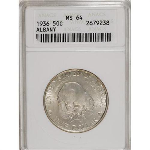 <B>1936 50C Albany MS64 ANACS.</B></I> NGC Census: (715/1656). PCGS Population (1538/2072). Mintage: 17,671. Numismedia Wsl. Price for NGC/PCGS coin in MS64: $300. (#9227)<BR><BR><b>Shipping:</b> Coins & Currency (<a target="_blank" href="http://www.heritageauctions.com/common/shipping.php">view shipping information</a>)