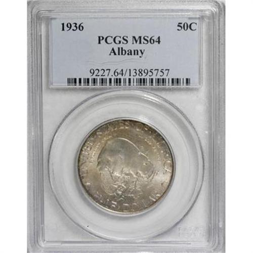 <B>1936 50C Albany MS64 PCGS.</B></I> PCGS Population (1512/2019). NGC Census: (700/1618). Mintage: 17,671. Numismedia Wsl. Price for NGC/PCGS coin in MS64: $308. (#9227)<BR><I>From The Frank DuVall Collection of U.S. Commemoratives.</B></I><BR><BR><b>Shipping:</b> Coins & Currency (<a target="_blank" href="http://www.heritageauctions.com/common/shipping.php">view shipping information</a>\)