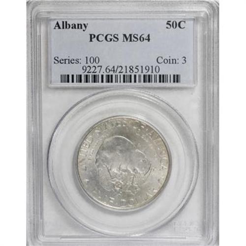 <B>1936 50C Albany MS64 PCGS.</B></I> PCGS Population (1512/2019). NGC Census: (700/1618). Mintage: 17,671. Numismedia Wsl. Price for NGC/PCGS coin in MS64: $308. (#9227)<BR><BR><b>Shipping:</b> Coins & Currency (<a target="_blank" href="http://www.heritageauctions.com/common/shipping.php">view shipping information</a>\)