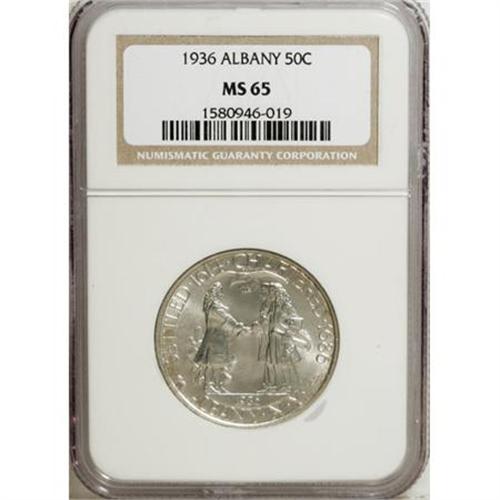 <B>1936 50C Albany MS65 NGC.</B></I> NGC Census: (1034/588). PCGS Population (1286/748). Mintage: 17,671. Numismedia Wsl. Price for NGC/PCGS coin in MS65: $360. (#9227)<BR><BR><b>Shipping:</b> Coins & Currency (<a target="_blank" href="http://www.heritageauctions.com/common/shipping.php">view shipping information</a>\)