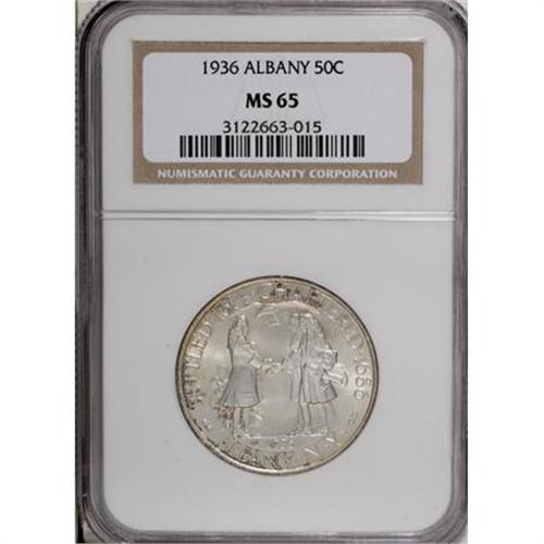 <B>1936 50C Albany MS65 NGC.</B></I> . NGC Census: (1059/592). PCGS Population (1305/762). Mintage: 17,671. Numismedia Wsl. Price for NGC/PCGS coin in MS65: $345. (#9227)<BR><BR><b>Shipping:</b> Coins & Currency (<a target="_blank" href="http://www.heritageauctions.com/common/shipping.php">view shipping information</a>)