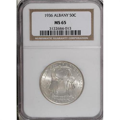 <B>1936 50C Albany MS65 NGC.</B></I> . NGC Census: (1060/592). PCGS Population (1305/762). Mintage: 17,671. Numismedia Wsl. Price for NGC/PCGS coin in MS65: $345. (#9227)<BR><BR><b>Shipping:</b> Coins & Currency (<a target="_blank" href="http://www.heritageauctions.com/common/shipping.php">view shipping information</a>)