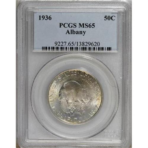 <B>1936 50C Albany MS65 PCGS.</B></I> PCGS Population (1285/748). NGC Census: (1034/588). Mintage: 17,671. Numismedia Wsl. Price for NGC/PCGS coin in MS65: $360. (#9227)<BR><BR><b>Shipping:</b> Coins & Currency (<a target="_blank" href="http://www.heritageauctions.com/common/shipping.php">view shipping information</a>\)