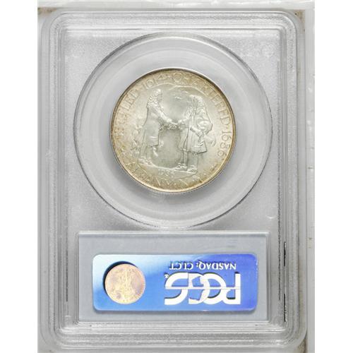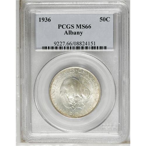 <B>1936<50C> Albany MS66 PCGS.</B></I> Satiny with a typical strike for this issue. Pale, streaky olive patina appears on both sides, mostly confined to the peripheral legends.