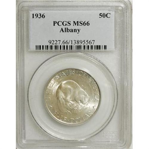<B>1936 50C Albany MS66 PCGS.</B></I> PCGS Population (658/81). NGC Census: (467/120). Mintage: 17,671. Numismedia Wsl. Price for NGC/PCGS coin in MS66: $595. (#9227)<BR><I>From The Frank DuVall Collection of U.S. Commemoratives.</B></I><BR><BR><b>Shipping:</b> Coins & Currency (<a target="_blank" href="http://www.heritageauctions.com/common/shipping.php">view shipping information</a>\)