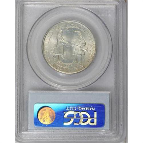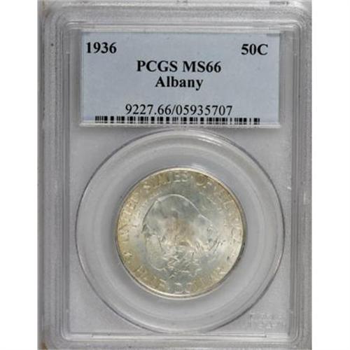 <B>1936 50C Albany MS66 PCGS.</B></I> Frosty and well struck with blushes of peach peripheral toning over the silver-gray surfaces. The Albany design, represented here by a Premium Gem, was the first commemorative design credit of Gertrude K. Lathrop.<BR><BR><b>Shipping:</b> Coins & Currency (<a target="_blank" href="http://www.heritageauctions.com/common/shipping.php">view shipping information</a>)