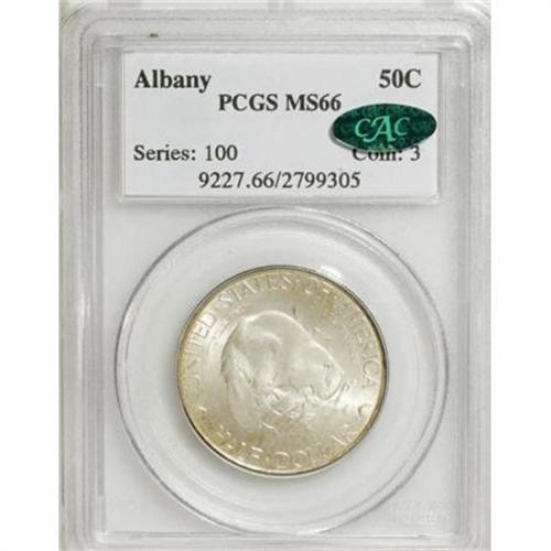 <B>1936 50C Albany MS66 PCGS. CAC.</B></I> Lustrous silver centers complement the golden peripheral elements on this delightful Premium Gem. Cartwheel luster abounds throughout both sides.<BR><I>From The Southwest Collection.</B></I><BR><BR><b>Shipping:</b> Coins & Currency (<a target="_blank" href="http://www.heritageauctions.com/common/shipping.php">view shipping information</a>)