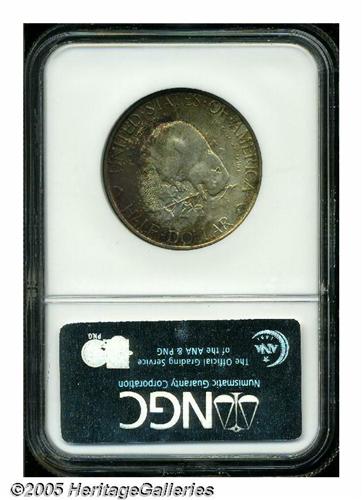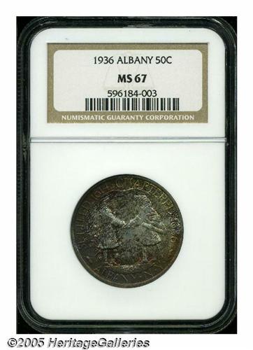 <B>1936<50C> Albany MS67 NGC.</B></I> Lushly toned in deep peripheral orange-red and aquamarine tints that gradually diminish to nearly untoned centers. A satiny, virtually immaculate, and boldly struck Superb Gem.
