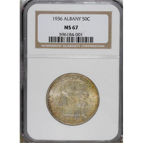<B>1936 50C Albany MS67 NGC.</B></I> The reverse is tab-toned in original gold, russet, and pearl-gray colors, and the obverse displays variegated honey, russet, and battleship-gray toning. Outstanding quality for this lustrous and virtually immaculate Superb Gem.<BR><BR><b>Shipping:</b> Coins & Currency (<a target="_blank" href="http://www.heritageauctions.com/common/shipping.php">view shipping information</a>)