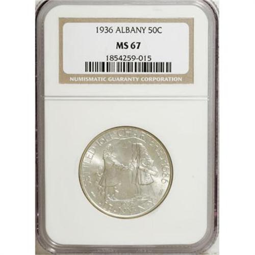 <B>1936 50C Albany MS67 NGC.</B></I> NGC Census: (113/7). PCGS Population (80/1). Mintage: 17,671. Numismedia Wsl. Price for NGC/PCGS coin in MS67: $1,575. (#9227)<BR><I>From The Frank DuVall Collection of U.S. Commemoratives.</B></I><BR><BR><b>Shipping:</b> Coins & Currency (<a target="_blank" href="http://www.heritageauctions.com/common/shipping.php">view shipping information</a>\)