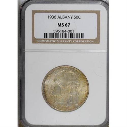 <B>1936 50C Albany MS67 NGC.</B></I> The reverse exhibits gold, russet, and pearl-gray tab toning, and the obverse displays variegated honey, russet, and battleship-gray patina. A wonderful Superb Gem exemplar of this local-interest silver commemorative. NGC has graded just seven finer pieces (8/07).<BR><BR><b>Shipping:</b> Coins & Currency (<a target="_blank" href="http://www.heritageauctions.com/common/shipping.php">view shipping information</a>)