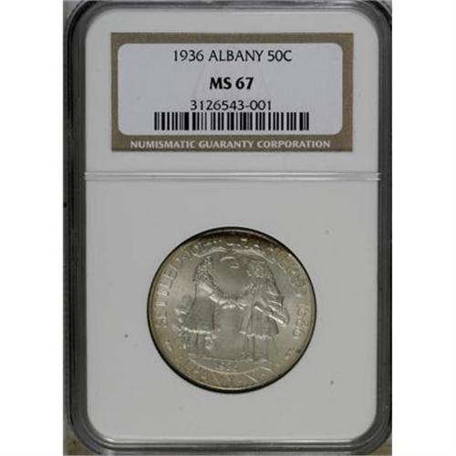 <B>1936 50C Albany MS67 NGC.</B></I> Whispers of gold-brown patina concentrate at the margins of this Albany commemorative. Well preserved, lustrous surfaces exhibit sharply struck design elements.<BR><BR><b>Shipping:</b> Coins & Currency (<a target="_blank" href="http://www.heritageauctions.com/common/shipping.php">view shipping information</a>)
