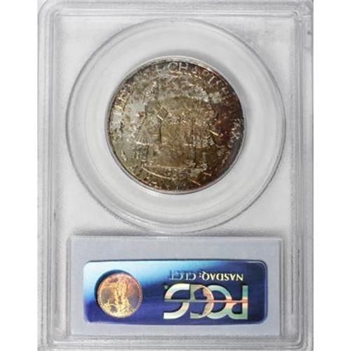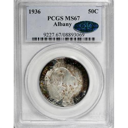 <B>1936 50C Albany MS67 PCGS. CAC.</B></I> Beautiful olive-gold, mauve, and cobalt-blue toning graces the obverse periphery, while the reverse is dominated by cherry-red and golden-brown. A satiny and splendidly preserved Superb Gem.<BR><I>From The Good Humor Collection.</B></I><BR><BR><b>Shipping:</b> Coins & Currency (<a target="_blank" href="http://www.heritageauctions.com/common/shipping.php">view shipping information</a>)