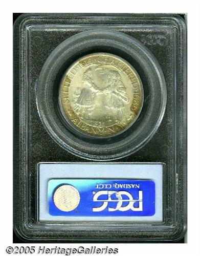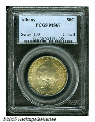 <B>1936<50C> Albany MS67 PCGS.</B></I> Spectacularly toned with waves of lime-green, rose-red, and gold colors, obviously gained from years of storage in an original cardboard holder of issue. An essentially pristine Superb Gem that has satiny luster and an unimprovable strike. Population: 73 in 67, 1 finer (4/05).