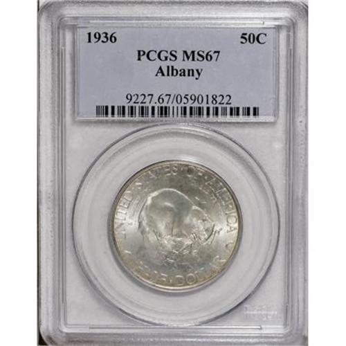 <B>1936 50C Albany MS67 PCGS.</B></I> Pleasingly detailed for this often-weak issue with delightful luster. The centers are minimally toned, while the margins show light golden patina with whispers of emerald. PCGS has graded one finer example (12/07).<BR><BR><b>Shipping:</b> Coins & Currency (<a target="_blank" href="http://www.heritageauctions.com/common/shipping.php">view shipping information</a>)