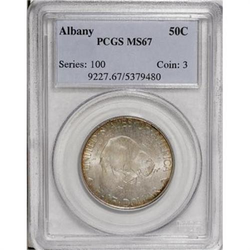<B>1936 50C Albany MS67 PCGS.</B></I> The centers of this Superb Gem are silver-blue, while the satiny margins show golden-tan and orange shadings. Well struck with excellent eye appeal for this local-interest issue.<BR><BR><b>Shipping:</b> Coins & Currency (<a target="_blank" href="http://www.heritageauctions.com/common/shipping.php">view shipping information</a>)