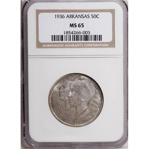 <B>1936 50C Arkansas MS65 NGC.</B></I> Accompanying the lot is a 106cm x 116cm x 13cm limestome block, shaped like Arkansas and bearing the inscription "ACME BRICK CO/LITTLE ROCK-FT SMITH/ARKANSAS/CENTENNIAL/1936." NGC Census: (225/54). PCGS Population (260/93). Mintage: 9,660. Numismedia Wsl. Price for NGC/PCGS coin in MS65: $216. (#9237)<BR><I>From The Frank DuVall Collection of U.S. Commemoratives.</B></I><BR><BR><b>Shipping:</b> Coins & Currency (<a target="_blank" href="http://www.heritageauctions.com/common/shipping.php">view shipping information</a>\)