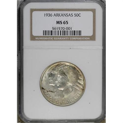 <B>1936 50C Arkansas MS65 NGC.</B></I> NGC Census: (228/55). PCGS Population (268/96). Mintage: 9,660. Numismedia Wsl. Price for NGC/PCGS coin in MS65: $216. (#9237)<BR><BR><b>Shipping:</b> Coins & Currency (<a target="_blank" href="http://www.heritageauctions.com/common/shipping.php">view shipping information</a>)