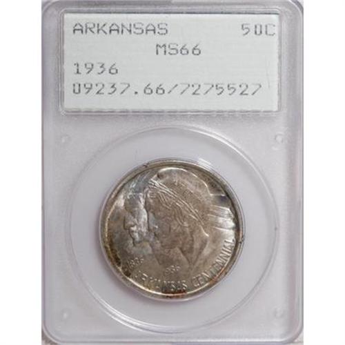 <B>1936 50C Arkansas MS66 PCGS.</B></I> PCGS Population (86/7). NGC Census: (48/6). Mintage: 9,660. Numismedia Wsl. Price for NGC/PCGS coin in MS66: $625. (#9237)<BR><BR><b>Shipping:</b> Coins & Currency (<a target="_blank" href="http://www.heritageauctions.com/common/shipping.php">view shipping information</a>\)