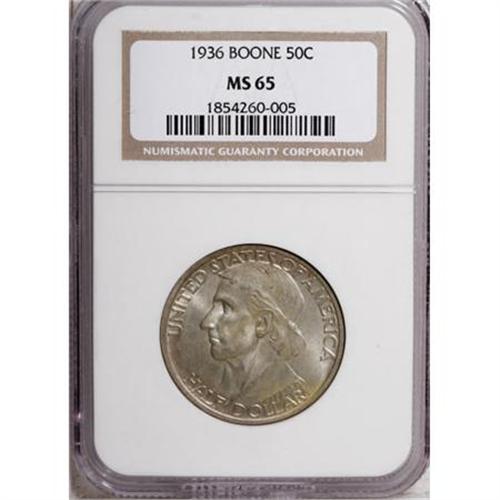 <B>1936 50C Boone MS65 NGC.</B></I> NGC Census: (508/254). PCGS Population (624/335). Mintage: 12,012. Numismedia Wsl. Price for NGC/PCGS coin in MS65: $220. (#9266)<BR><I>From The Frank DuVall Collection of U.S. Commemoratives.</B></I><BR><BR><b>Shipping:</b> Coins & Currency (<a target="_blank" href="http://www.heritageauctions.com/common/shipping.php">view shipping information</a>\)