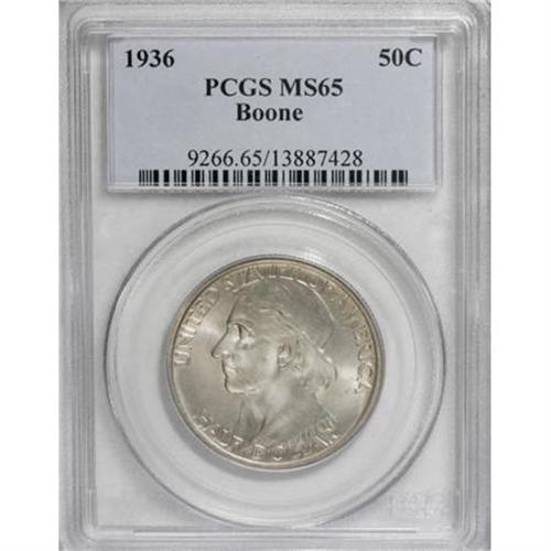 <B>1936 50C Boone MS65 PCGS.</B></I> PCGS Population (624/335). NGC Census: (508/254). Mintage: 12,012. Numismedia Wsl. Price for NGC/PCGS coin in MS65: $220. (#9266)<BR><I>From The Frank DuVall Collection of U.S. Commemoratives.</B></I><BR><BR><b>Shipping:</b> Coins & Currency (<a target="_blank" href="http://www.heritageauctions.com/common/shipping.php">view shipping information</a>\)