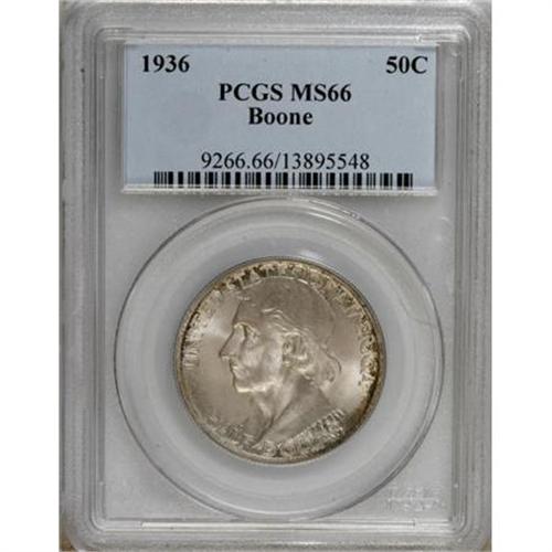 <B>1936 50C Boone MS66 PCGS.</B></I> PCGS Population (277/58). NGC Census: (217/37). Mintage: 12,012. Numismedia Wsl. Price for NGC/PCGS coin in MS66: $344. (#9266)<BR><BR><b>Shipping:</b> Coins & Currency (<a target="_blank" href="http://www.heritageauctions.com/common/shipping.php">view shipping information</a>\)