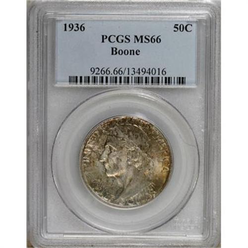 <B>1936 50C Boone MS66 PCGS.</B></I> PCGS Population (276/59). NGC Census: (217/37). Mintage: 12,012. Numismedia Wsl. Price for NGC/PCGS coin in MS66: $344. (#9266)<BR><BR><b>Shipping:</b> Coins & Currency (<a target="_blank" href="http://www.heritageauctions.com/common/shipping.php">view shipping information</a>)