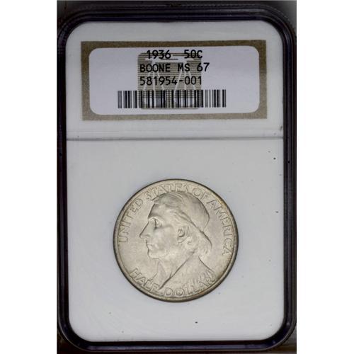 <B>1936<50C> Boone MS67 NGC.</B></I> Deep orange, ruby, and russet graces the reverse border, but the majority of this lustrous Superb Gem is only gently toned cream-gray. 1936 broke the budget of many commemorative collectors, since dozens of different varieties were issued that year. Census: 35 in 67, 1 finer (3/06). <BR><BR><B>Important notice:</B> Heritage usually auctions material at the rate of 200-250 lots per hour. On some occasions eBay Live bid software or the Internet may not be able to keep up with the pace of the auction. We recommend placing a realistic absentee bid now as insurance to avoid disappointment. Occasionally the auctioneer may eliminate or reject an eBay Live bid, and the auctioneer may also reopen a lot after the close of the eBay live bidding (usually because we missed an audience bid), and may reject your bid even if it shows you as the winning bidder. By bidding via eBay Live, you agree that Heritage may award the lot to another bidder at its sole discretion under the circumstances described above or any other reasonable circumstances. Since eBay bids are not shown to us until we open the lot on the floor, we treat those bids just like floor bids. In most cases the floor responds before the eBay bid is presented to us, due to Internet lag time, so for consistency we have made it a policy that floor bids are always considered first over tie eBay live bids. Also please note that all Heritage lots purchased through eBay Live carry a 20% Buyer's Premium. Please make sure you read the Terms and Conditions before you bid. This lot is being auctioned in conjunction with a live floor auction by Heritage Galleries & Auctioneers. All final auction and invoice information will be supplied by Heritage Galleries & Auctioneers, and all other information should be considered preliminary. Lot:4883 <BR><BR><B>Winning Notification and Billing:</B> After the FINAL session in this auction is complete, Heritage will send e-mail and snail mail invoices. This process normally takes several days. All final auction and invoice information will be supplied by Heritage Galleries & Auctioneers, and all other information should be considered preliminary. <BR><BR>This auction will be conducted on a live auction floor and over the Internet through eBay Live. If you choose to place an absentee bid, please take a moment to <font color='#0000ff'><u><a href='http://pages.ebay.com/liveauctions/help/before/laabsentee.html'>learn how eBay Live absentee bidding works</a></u></font><font color='#000000'>