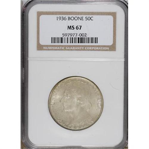 <B>1936 50C Boone MS67 NGC.</B></I> Original cream-gray, powder-blue, and apricot patina embraces this satiny and attractively preserved Boone commemorative. The reverse is virtually pristine.<BR><BR><b>Shipping:</b> Coins & Currency (<a target="_blank" href="http://www.heritageauctions.com/common/shipping.php">view shipping information</a>)