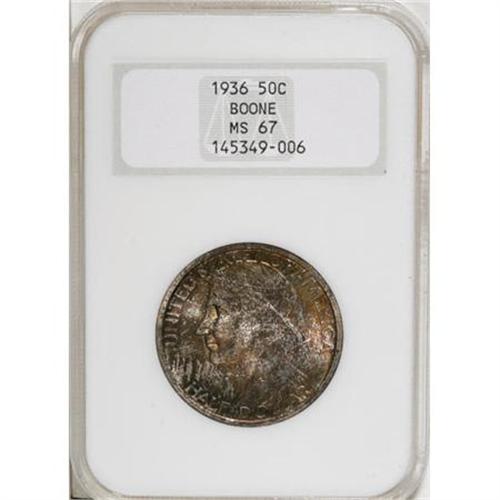 <B>1936 50C Boone MS67 NGC.</B></I> Dappled violet, tan, and silver-gray toning graces each side of this immensely lustrous Superb Gem. A solidly struck and eminently appealing survivor from this mid-date issue. Census: 38 in 67, 3 finer (11/07).<BR><BR><b>Shipping:</b> Coins & Currency (<a target="_blank" href="http://www.heritageauctions.com/common/shipping.php">view shipping information</a>)
