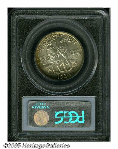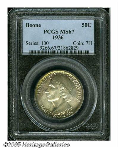 <B>1936<50C> Boone MS67 PCGS.</B></I> Fully struck and exquisitely preserved, this beautiful premium Gem displays full satin luster, lovely apricot, purple, and sea-green peripheral toning, and only has one or two superficial contact marks on each side, that are too small to distract the eye. Population: 51 in 67, 1 finer (3/05).