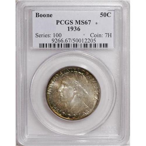 <B>1936 50C Boone MS67 PCGS.</B></I> Lovely lemon-gold and sea-green peripheral patina graces the obverse. This satiny and meticulously struck Superb Gem is refreshingly void of contact.<BR><I>From The Cary & Cheryl Porter Collection, Part Three.</B></I><BR><BR><b>Shipping:</b> Coins & Currency (<a target="_blank" href="http://www.heritageauctions.com/common/shipping.php">view shipping information</a>\)