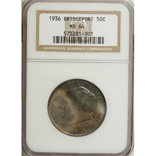 <B>1936 50C Bridgeport MS64 NGC.</B></I> NGC Census: (931/1297). PCGS Population (1656/2040). Mintage: 25,015. Numismedia Wsl. Price for NGC/PCGS coin in MS64: $160. (#9279)<BR><BR><b>Shipping:</b> Coins & Currency (<a target="_blank" href="http://www.heritageauctions.com/common/shipping.php">view shipping information</a>\)