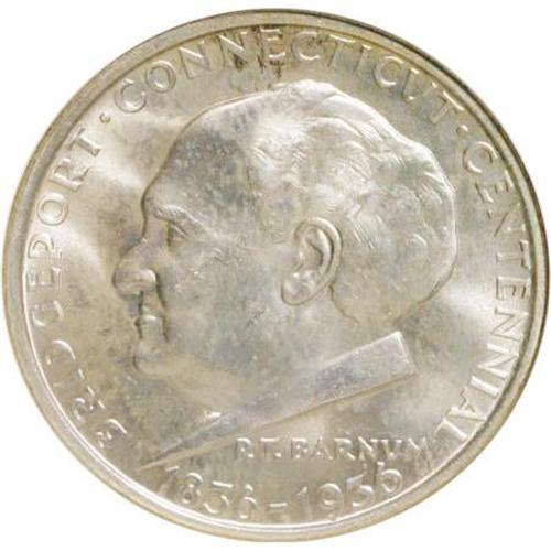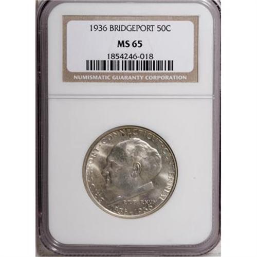 <B>1936 50C Bridgeport MS65 NGC.</B></I> NGC Census: (1008/304). PCGS Population (1404/636). Mintage: 25,015. Numismedia Wsl. Price for NGC/PCGS coin in MS65: $272. (#9279)<BR><I>From The Frank DuVall Collection of U.S. Commemoratives.</B></I><BR><BR><b>Shipping:</b> Coins & Currency (<a target="_blank" href="http://www.heritageauctions.com/common/shipping.php">view shipping information</a>\)