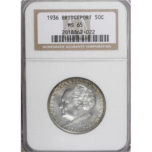 <B>1936 50C Bridgeport MS65 NGC.</B></I> NGC Census: (1008/304). PCGS Population (1404/636). Mintage: 25,015. Numismedia Wsl. Price for NGC/PCGS coin in MS65: $272. (#9279)<BR><BR><b>Shipping:</b> Coins & Currency (<a target="_blank" href="http://www.heritageauctions.com/common/shipping.php">view shipping information</a>\)
