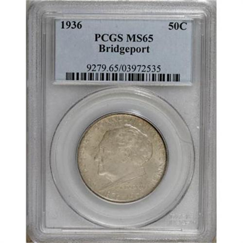 <B>1936 50C Bridgeport MS65 PCGS.</B></I> PCGS Population (1404/636). NGC Census: (1008/304). Mintage: 25,015. Numismedia Wsl. Price for NGC/PCGS coin in MS65: $272. (#9279)<BR><BR><b>Shipping:</b> Coins & Currency (<a target="_blank" href="http://www.heritageauctions.com/common/shipping.php">view shipping information</a>\)
