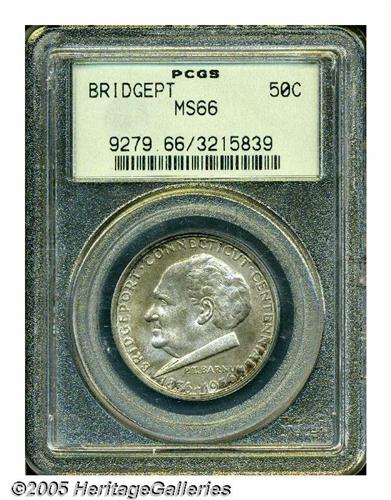 <B>1936<50C> Bridgeport MS66 PCGS.</B></I> Well struck with pleasing original toning on the obverse and remarkably clean surfaces overall. Lustrous and satiny, an attractive Premium Gem.