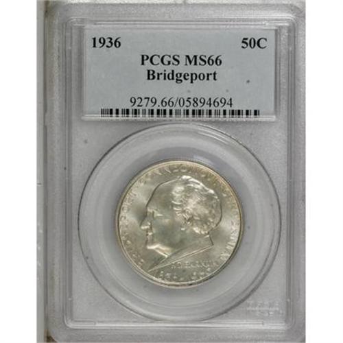 <B>1936 50C Bridgeport MS66 PCGS.</B></I> PCGS Population (626/61). NGC Census: (302/18). Mintage: 25,015. Numismedia Wsl. Price for NGC/PCGS coin in MS66: $380. (#9279)<BR><BR><b>Shipping:</b> Coins & Currency (<a target="_blank" href="http://www.heritageauctions.com/common/shipping.php">view shipping information</a>)